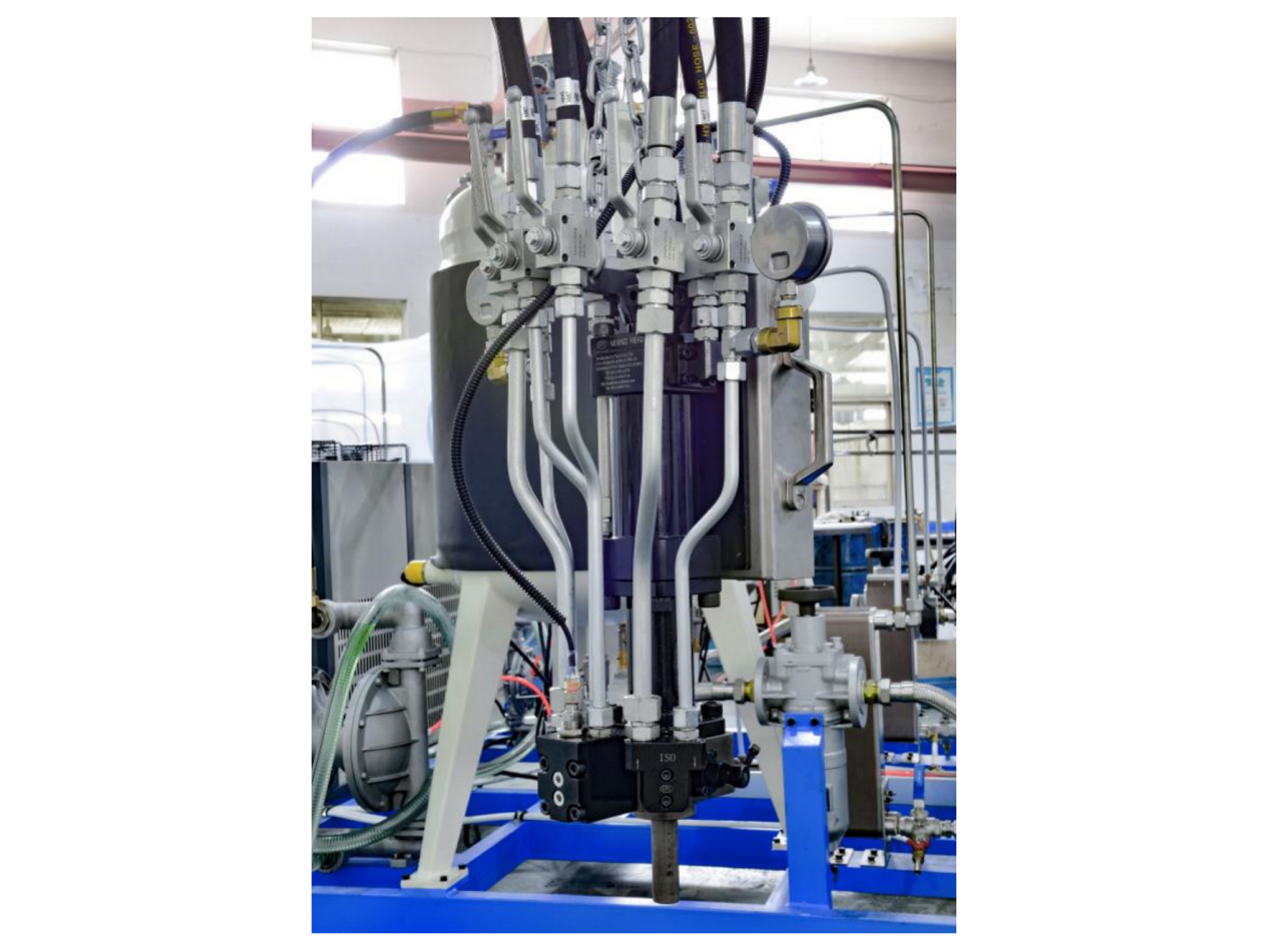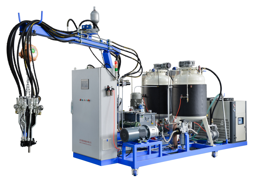 二組份聚氨酯高壓發(fā)泡機是將A料多元醇與B料異氰酸酯兩組份原料分別儲存在兩個儲料罐中,通過兩臺高精度柱塞計 量泵輸送至混合槍頭,兩物料通過高壓霧化對射進行混合,高壓霧化碰撞混合的效果非常好,物料混合極其均勻,泡孔非常細膩,制品質(zhì)量非常穩(wěn)定可靠。